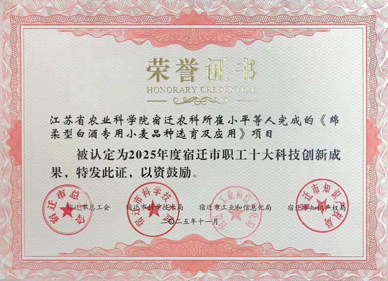 近日,我院酿造原粮团队最新研究成果《绵柔型白酒专用小麦品种选育及应用》荣获2025年度宿迁市职工十大科技创新成果。团队通过品种与技术创新,构建了集分子标记辅助选择病害抗性基因与制曲理化指标筛选于一体的高效育种技术体系,培育了“富麦666”“泗麦1702”等一系列绵柔型白酒专用小麦新品种(系),同时配套制定了制曲小麦优质高产生产系列技术标准,有效解决了传统大曲原粮因普通小麦硬度高、蛋白质波动大、抗病性弱所导致的酒体绵柔度不稳定、有害副产物偏高等问题,补齐了宿迁优质大曲专用原粮种源缺失短板。该成果对推动宿迁酿酒原粮本地化基地建设,促进白酒产业提档升级具有重要意义。